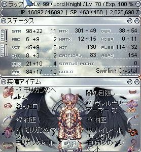 転生時に設定した自力STR120、LUK100を達成。鎧が判り難いですが地デリが刺さっています。
